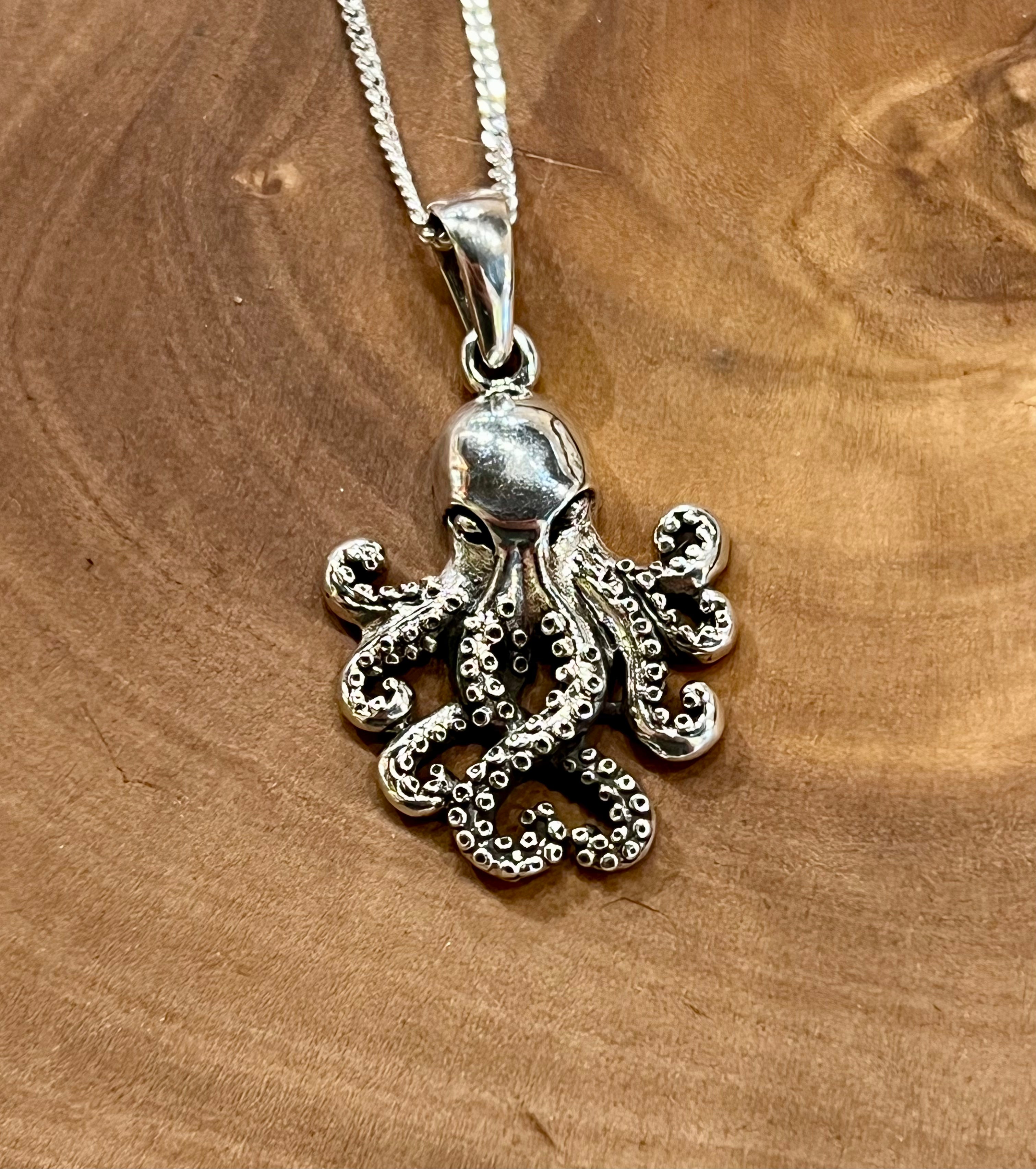 Sterling silver octopus pendant. A beautiful statement piece with lots of detail. Comes on thin 18" sterling silver curb chain.