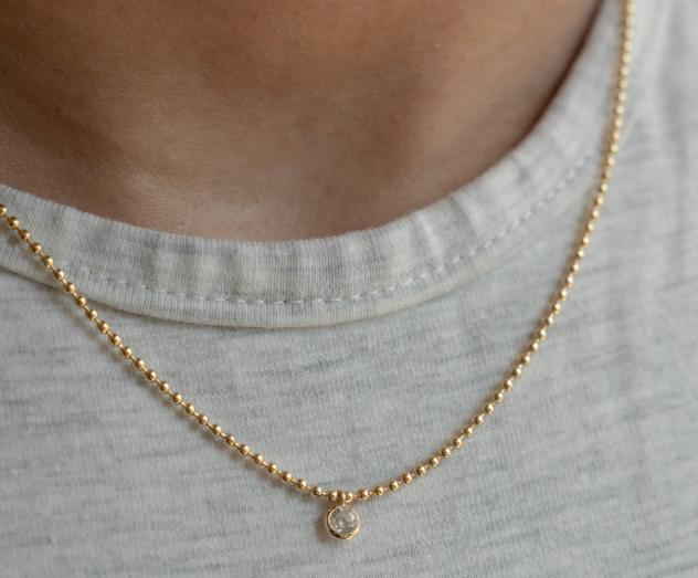 1.5mm gold vermeil ball chain, with a 4.5mm cubic zirconia bezel set. 16" + 2" extention.