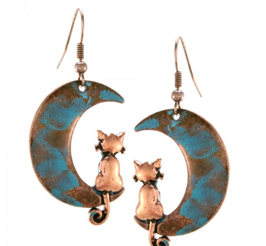 Cat sitting on Crescent moon dangle earrings