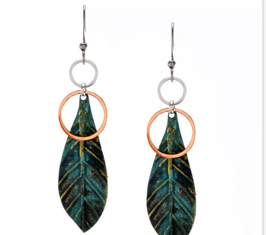 Leaf dangle earring with 2 tone circles, oxidized copper