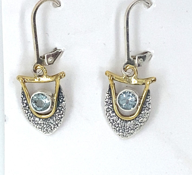 Sterling silver with gold plating, shield shape earrings with cubic zirconia or labradorite, hammered texture.
