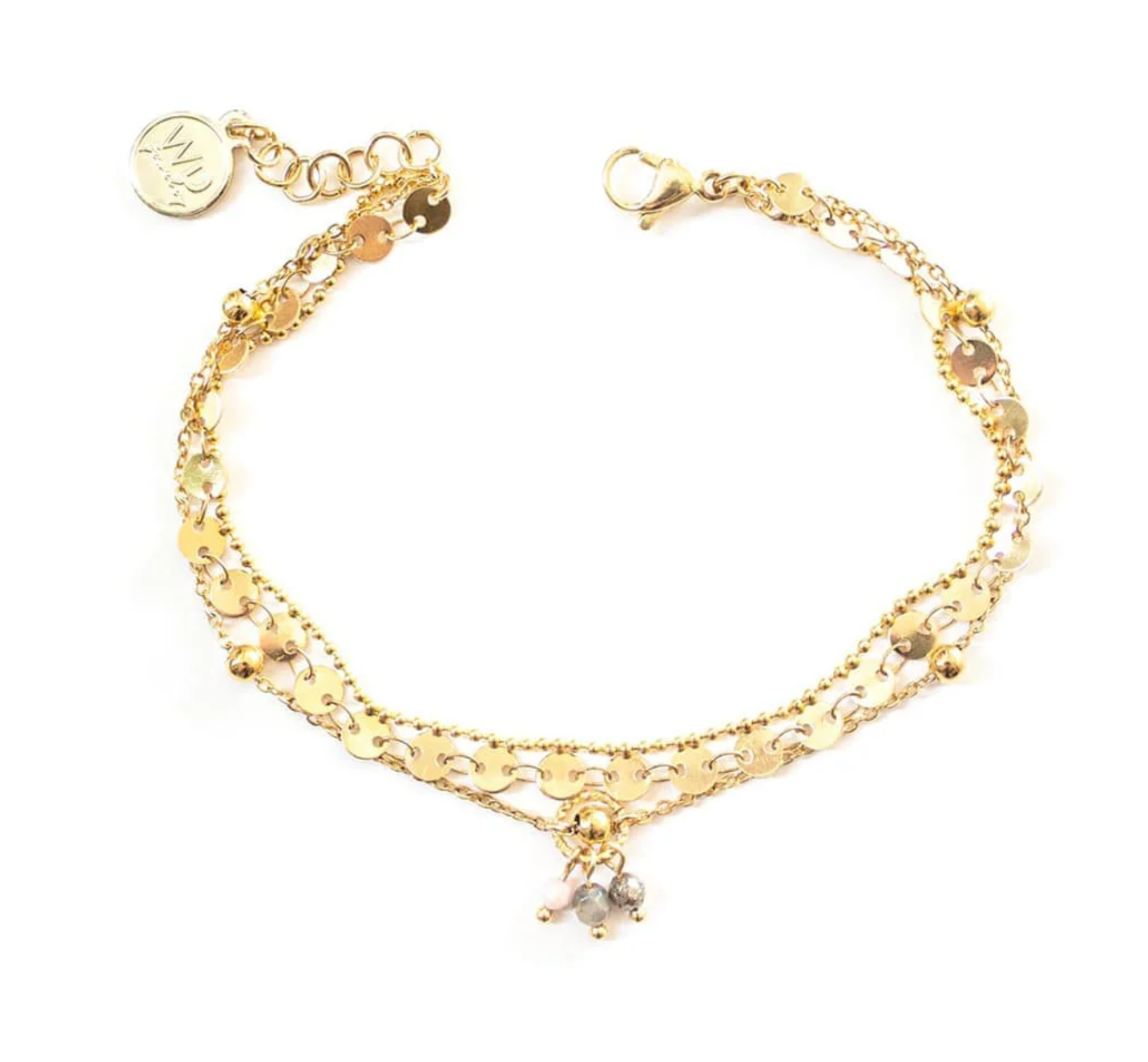 This anklet is a show-stealer. Match it with your cutest pair of shoes for a stunning look! Bella is a 24K gold plated multi-strand anklet. The first layer is orned with delicate gold beads and the second is a flat disc gold chain. The third layer is adorned with gold beads and a twisted ring that features semi-precious stones as pyrite, rhodonite, and labradorite. Stop looking, Bella is the one!