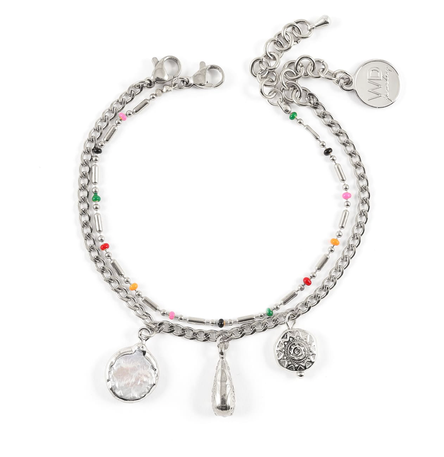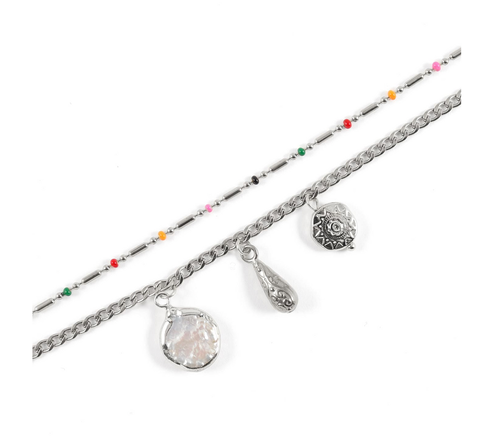 The silver Confetti bracelet duo is a celebration for your wrist—two distinct yet perfectly complementary chains. One sparkles with colorful beads; the other tells a symbolic story with three charms: a silver-plated sun medallion, a stainless steel drop pendant, and a mother-of-pearl pendant. The best part? They're detachable—wear them together, or solo. Your look, your rhythm.
