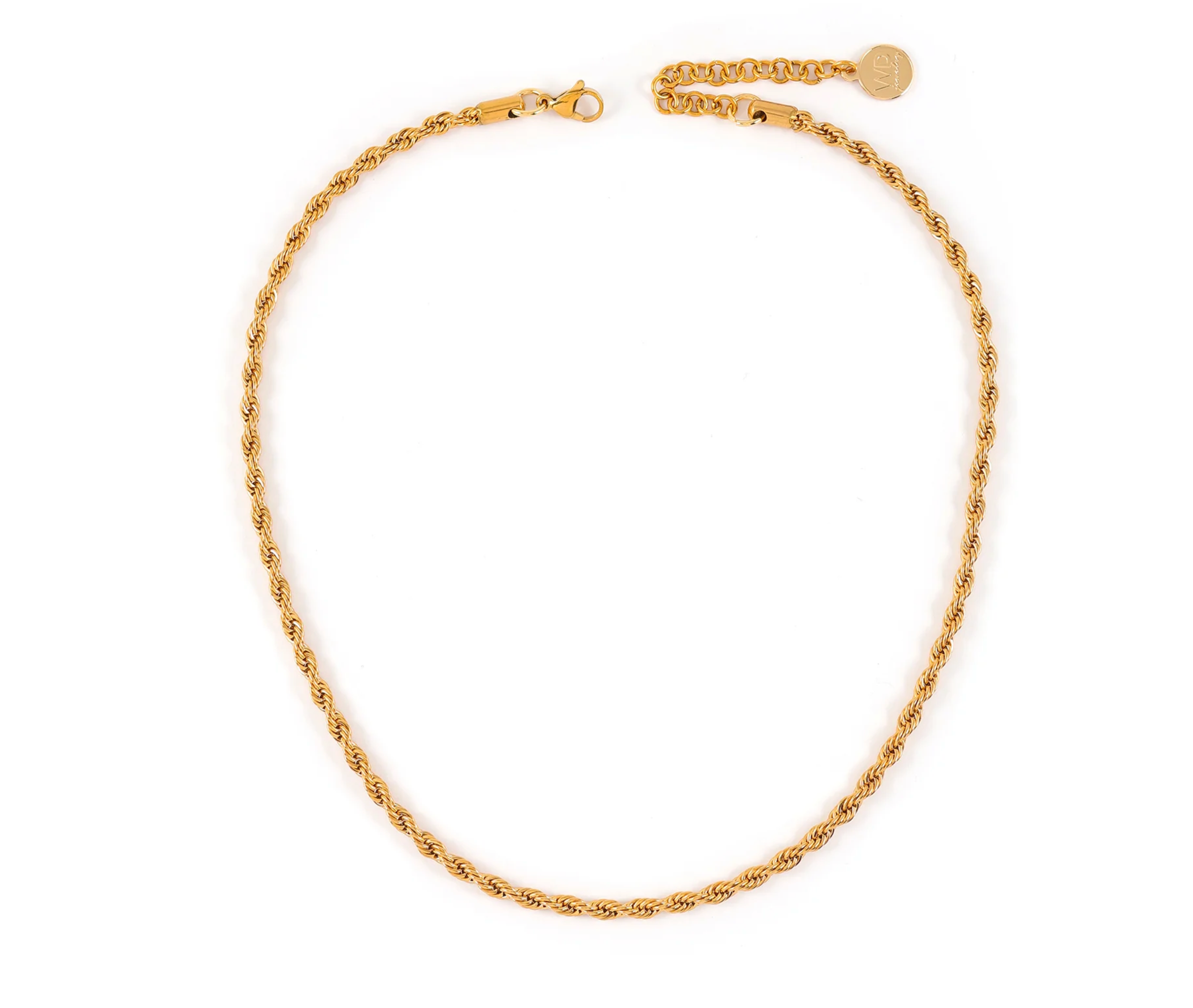 Bring bold texture and modern edge with the gold Torsade necklace. Featuring a thick stainless steel rope chain, this short necklace sits perfectly at the collarbone, adding a structured yet effortless touch to any look. A statement piece that feels like an everyday essential, it gives just the right amount of attitude—no overthinking, just pure style. Perfect for stacking