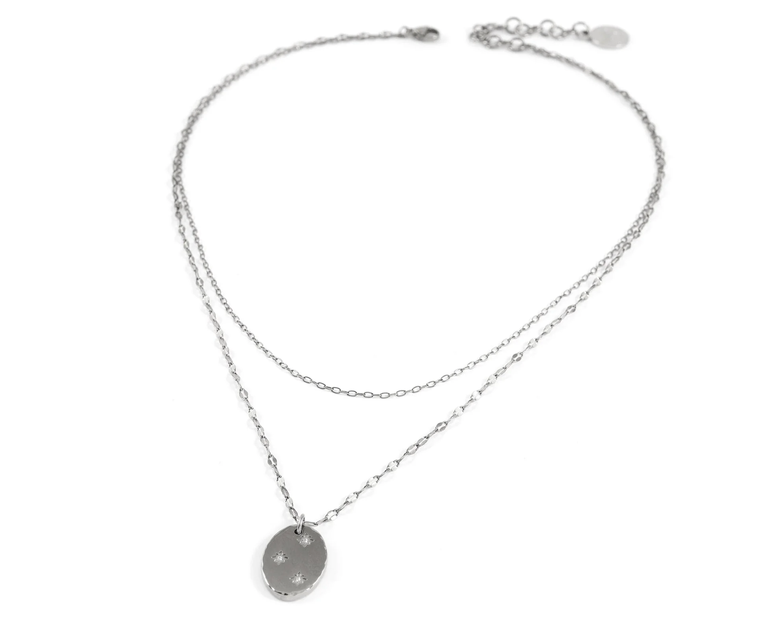The Zephira silver necklace is like a whisper of stardust around your neck. Its delicate layered stainless steel chains create an effortless stacked look, while the sterling silver-plated oval pendant adds a celestial touch. Etched with three tiny stars, each cradling a shimmering cubic zirconia, this piece feels like a secret wish made under a night sky. Light, dreamy, and endlessly wearable, it’s the kind of necklace that makes everyday magic feel real.