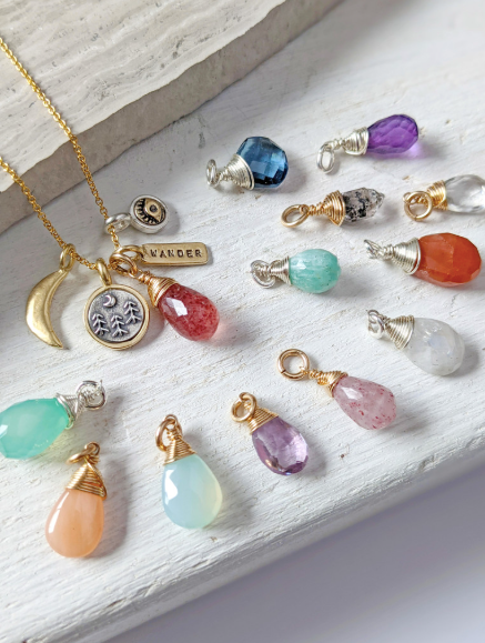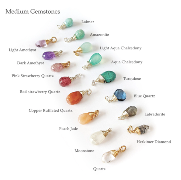 Add a little sparkle to your Marmalade creation by adding a genuine gemstone! Each stone is handpicked, wire wrapped with sterling silver or gold filled wire, and added to your necklace or bracelet here in the Marmalade studio.