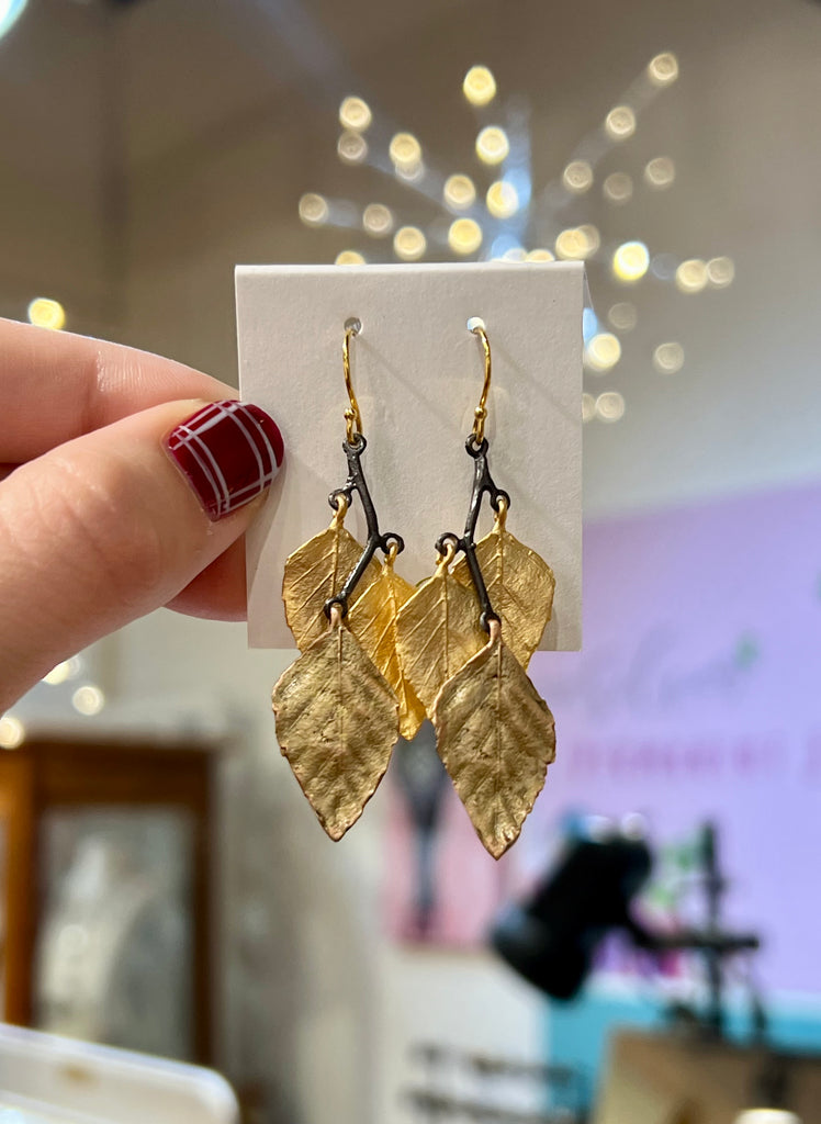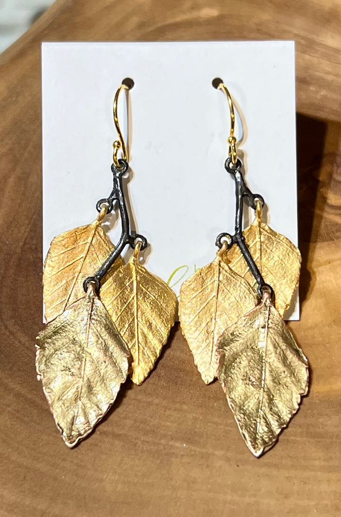 These earrings are cast in bronze with a trio of finishes, including 24kt gold plating, antique bronze with copper highlights, and brown patina. Hooks are 925 silver with a 24kt gold plating.