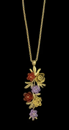 The Chrysanthemum pendant is cast in hand painted bronze and accented with yellow, purple, and red cast glass flowers.