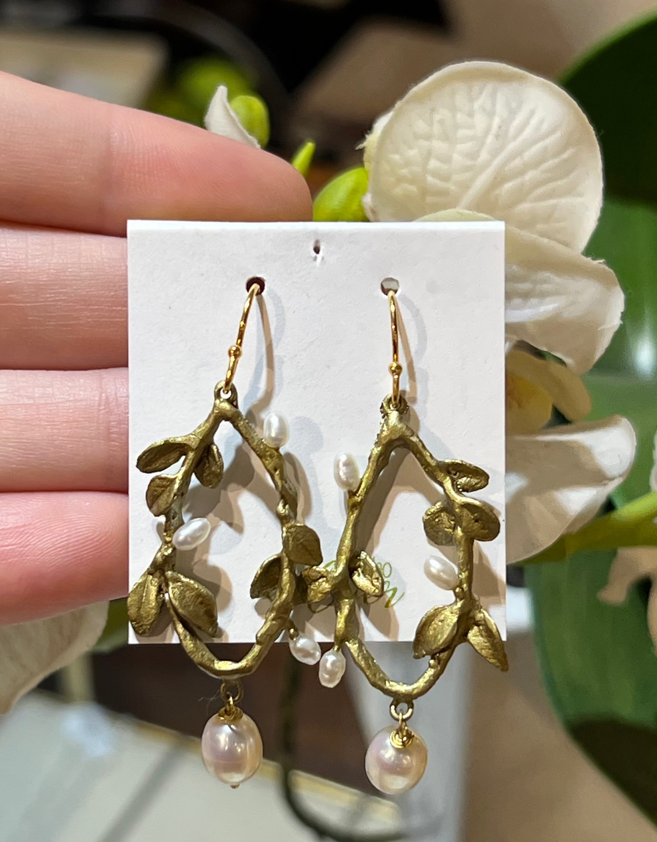 Cast bronze with patina finish, accented with freshwater pearls.
