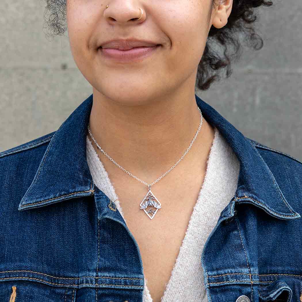 Add this sterling silver hanging bat on branches in diamond frame necklace to your shop for those who want to flaunt their darker side. She hangs from the detailed branches with her wings spread wide, this cave dweller is a creature of the night. Due to their keen senses, bats symbolize intuition, dreams, and visions to many cultures. And, though not known for their charm & warmth, bats are very nurturing, exhibit verbal communication, touching, and sensitivity to members of their group. The diamond shape is not only a beautiful way to frame the bat and branches, but also provides space for you to attach charms and beads. Find other creatures of the night in the Halloween Collection. Comes on a simple sterling silver 18" cable chain with spring ring clasp. Charm measures 30x21mm, excluding jumpring.