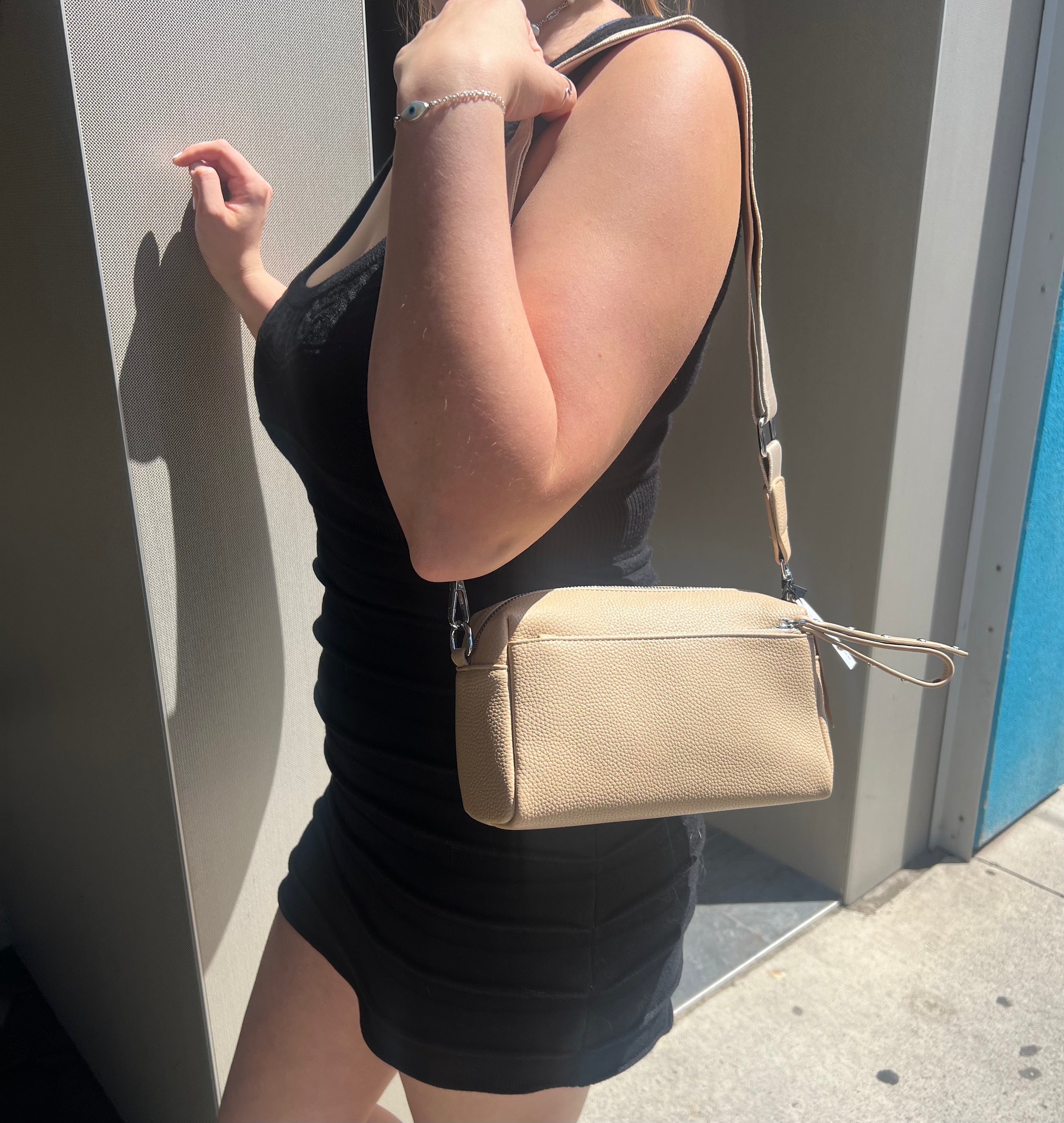 Supple soft leather crossbody bag with studded handles. Wide strap for comfort with adjustment. 2 exterior zipper pockets. Wide bottom makes it easy to see inside just the right size.