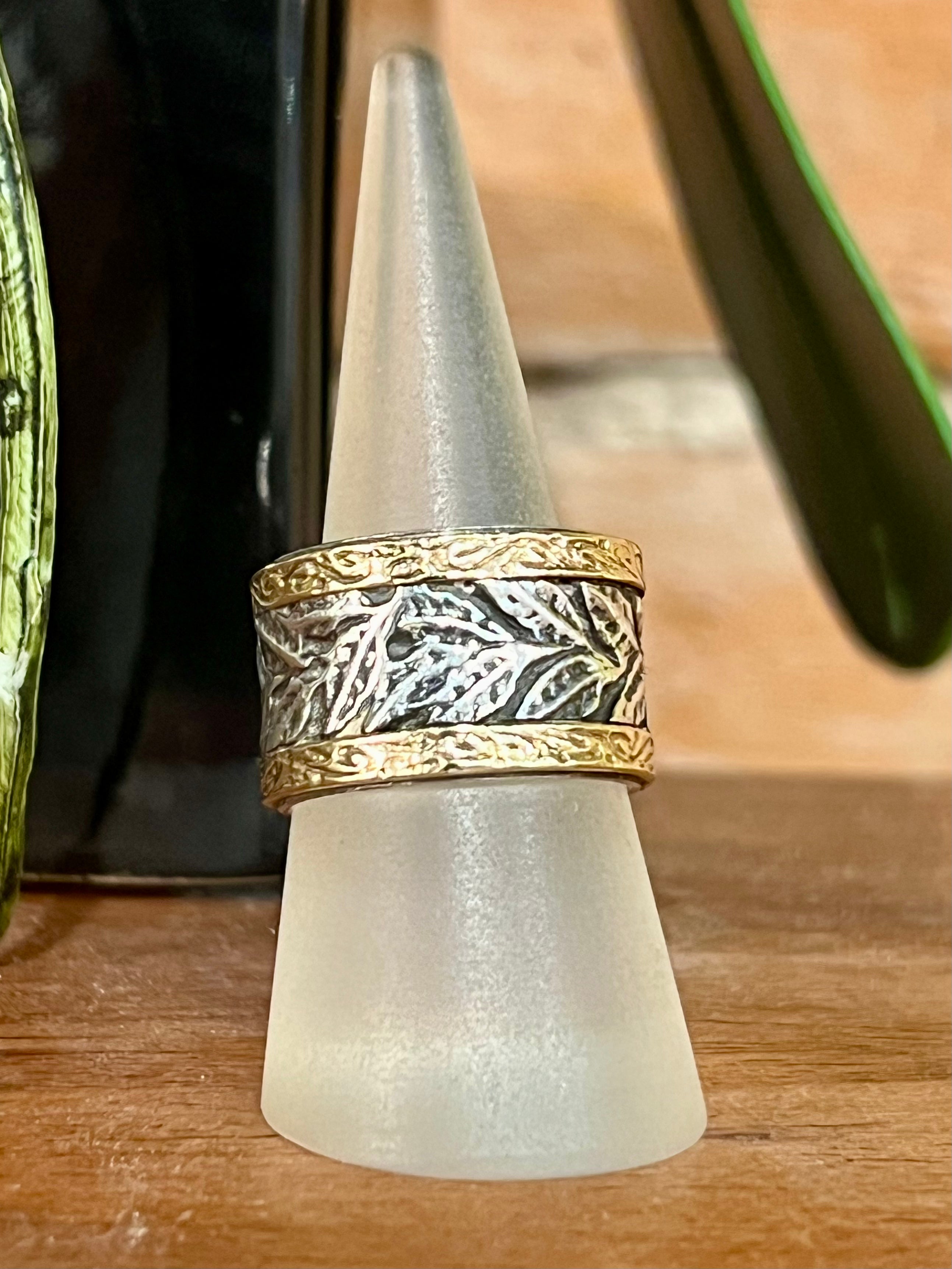 Sterling silver oxidized band with leaf vine, and two 9k gold bands.