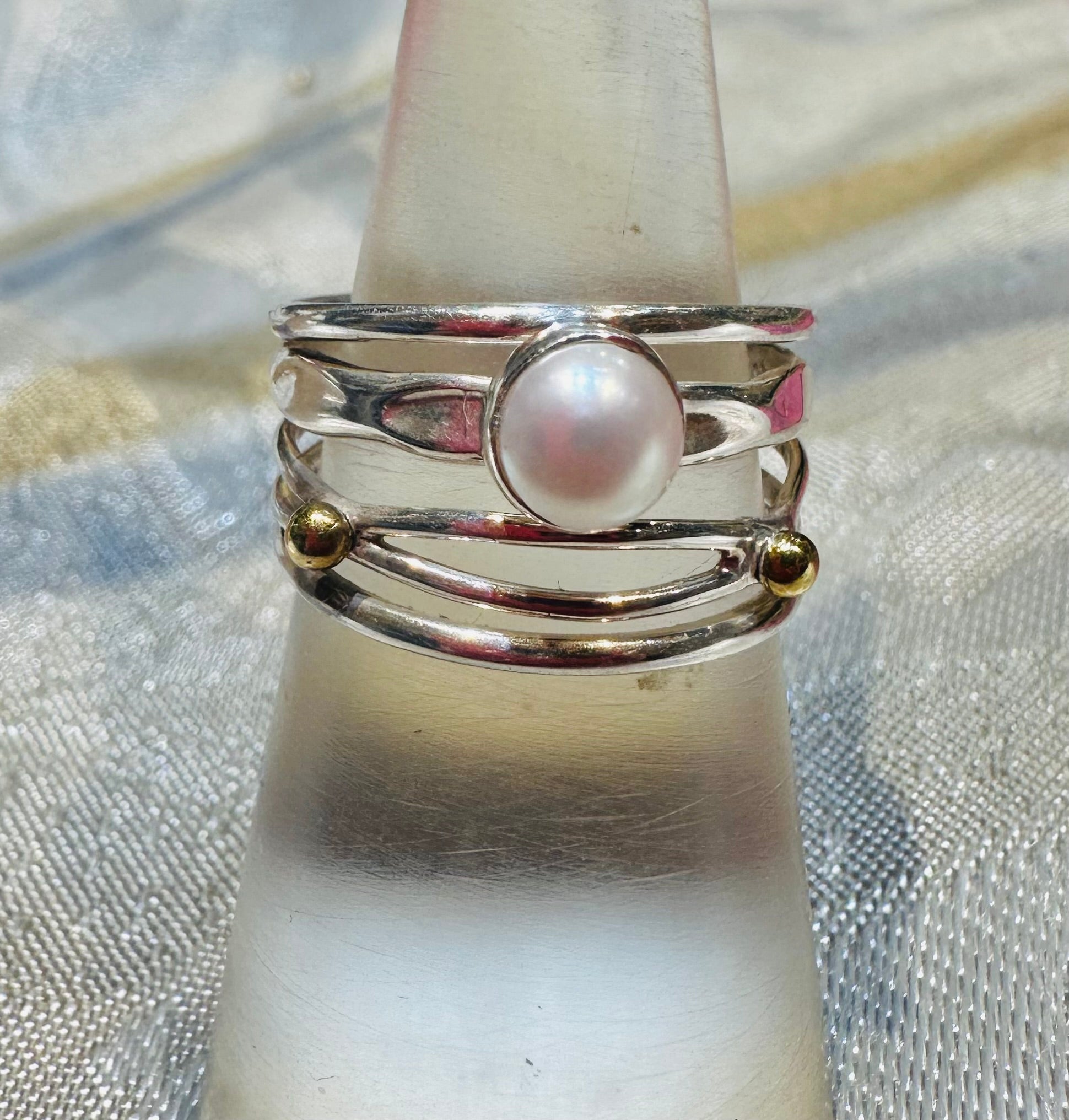 Sterling Silver multi wave ring with a Pearl and gold dots
