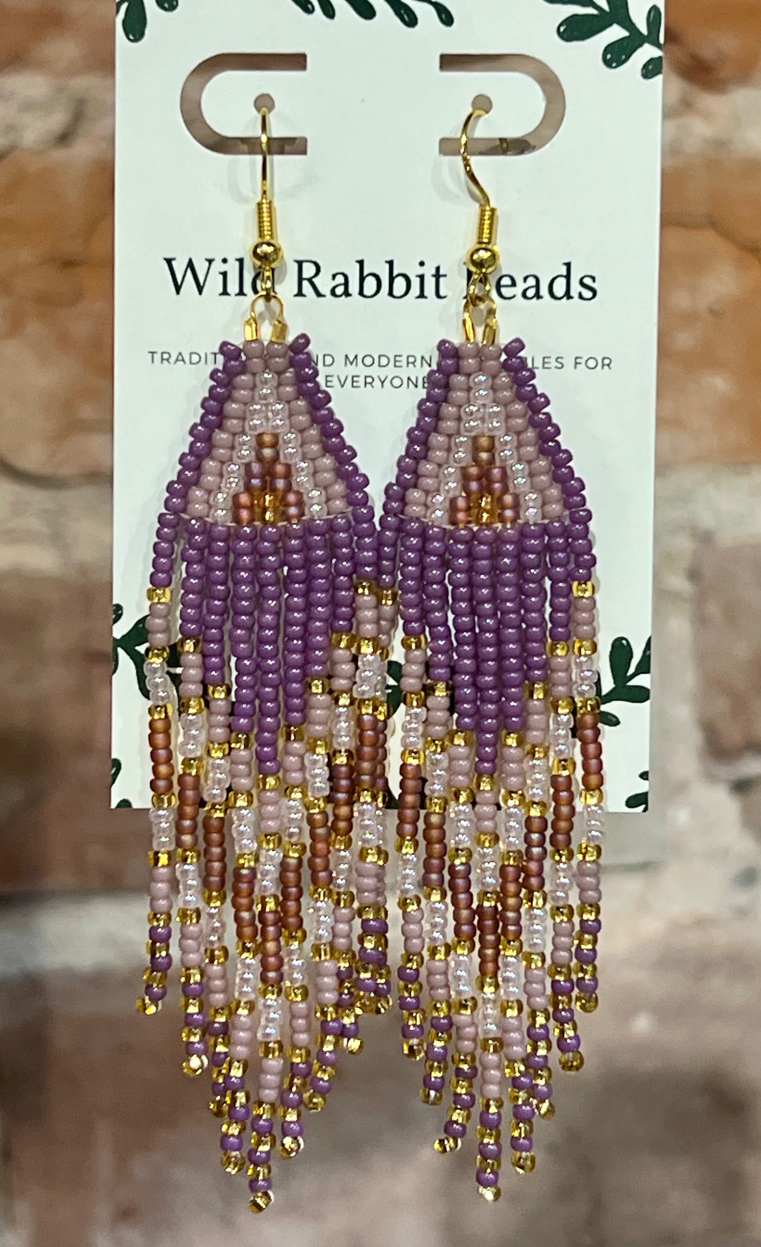 Handmade beaded earrings on gold plated hooks, made by local Indigenous artist - Wild Rabbit Beads. "Traditional and modern wearables for everyone."