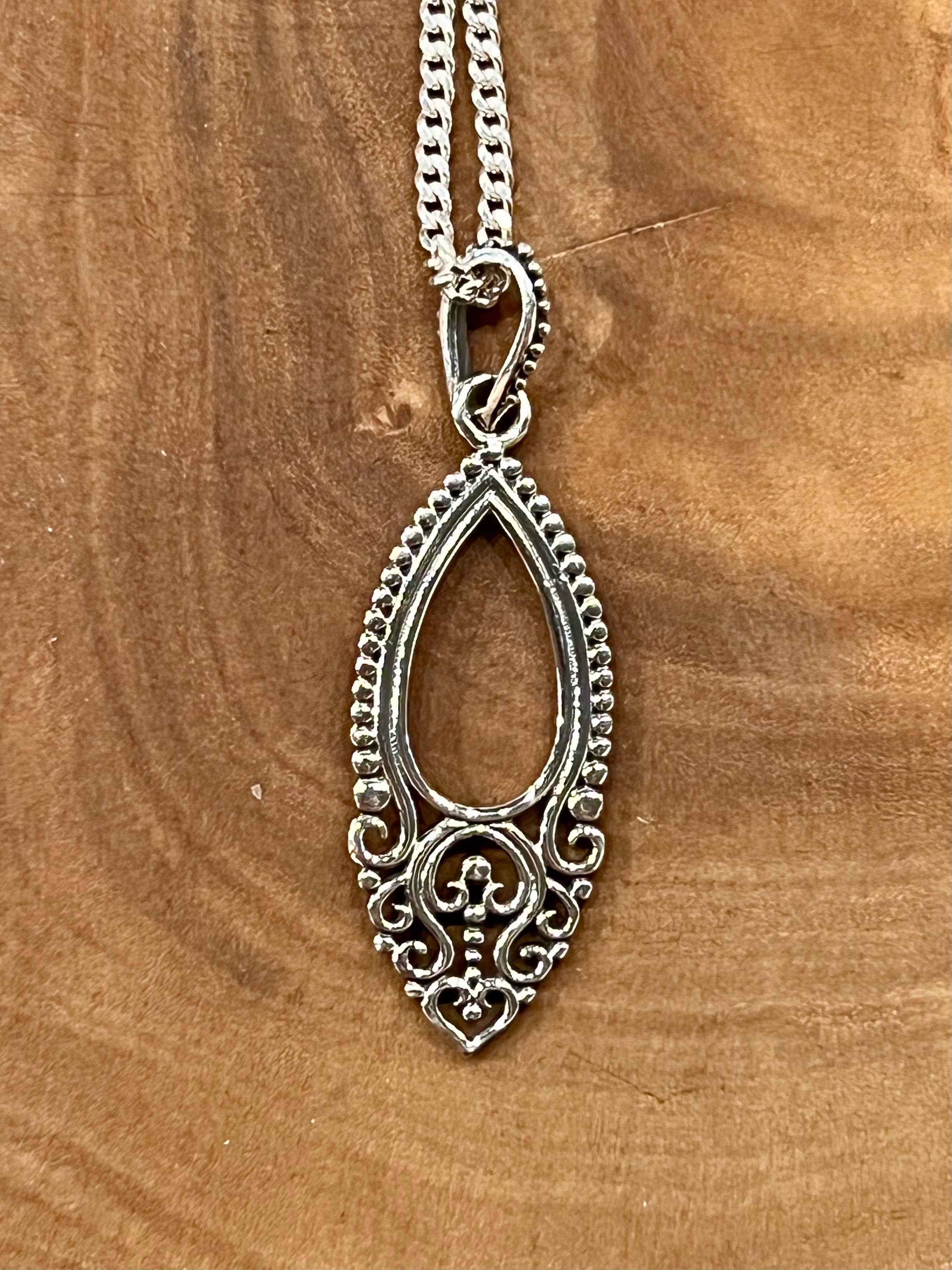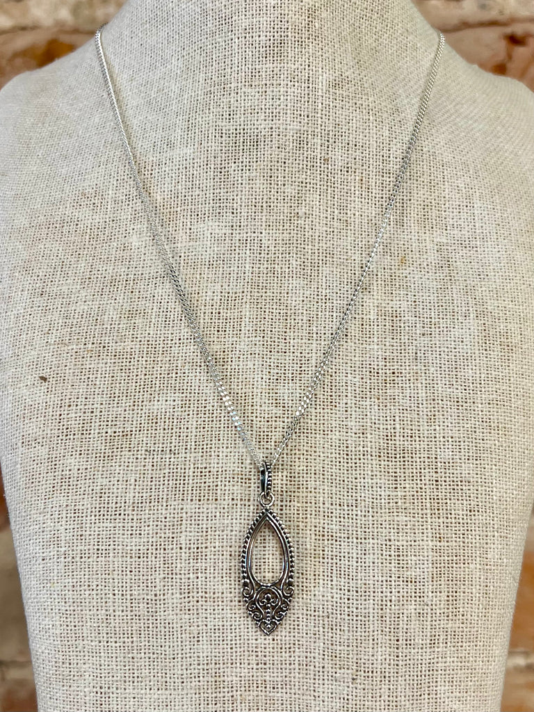 Sterling silver filigree teardrop pendant, 16" curb chain.