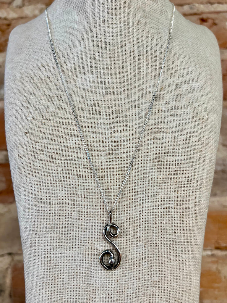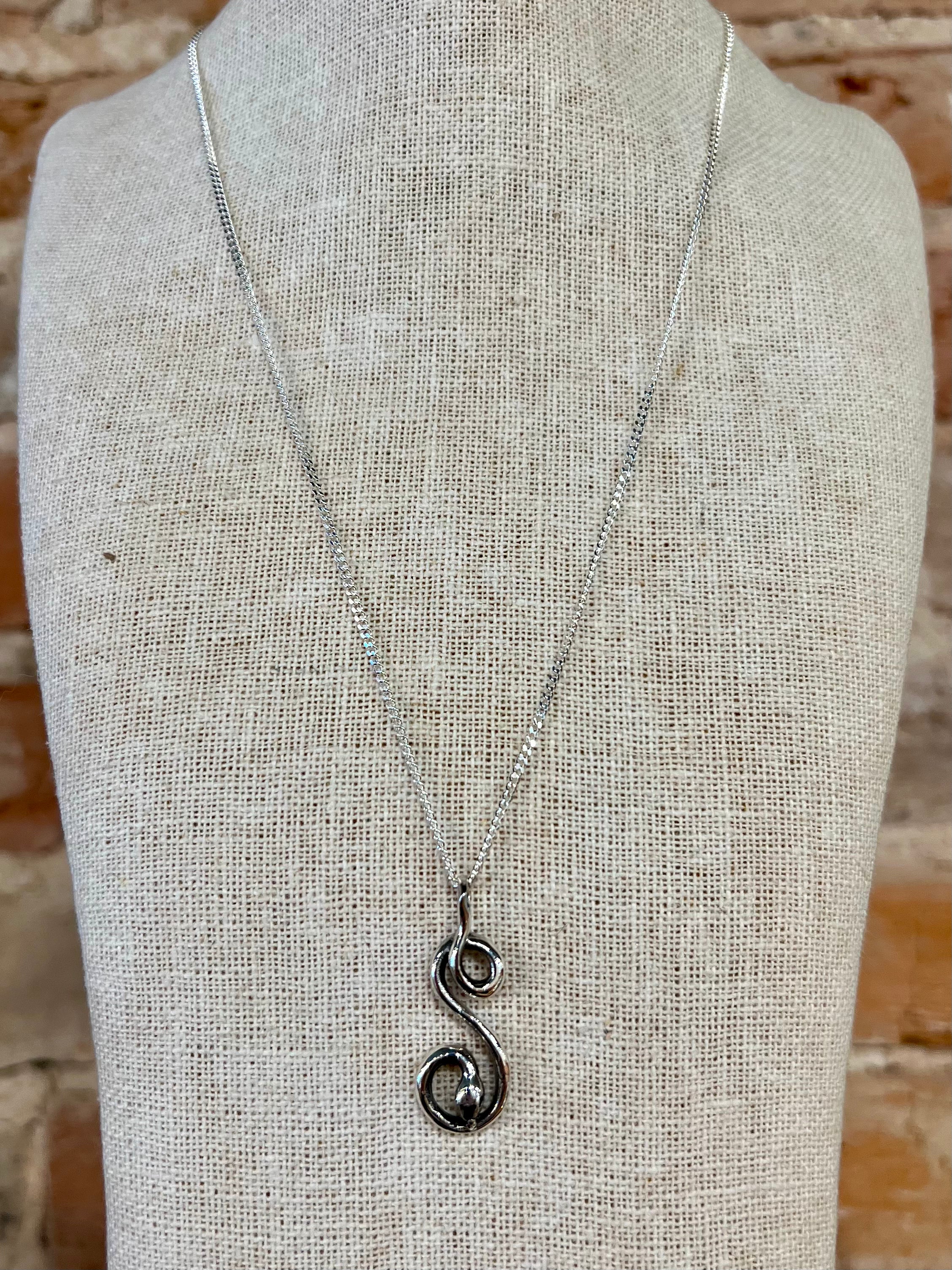 Sterling silver snake pendant in a S shape, on a 16" curb chain.
