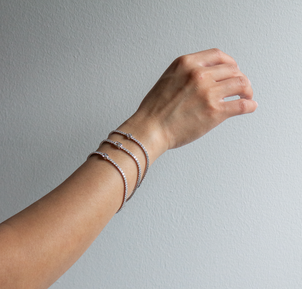 Chic sterling silver tennis bracelet with bezel set oval CZ stones and a rhodium-plated finish for lasting brilliance