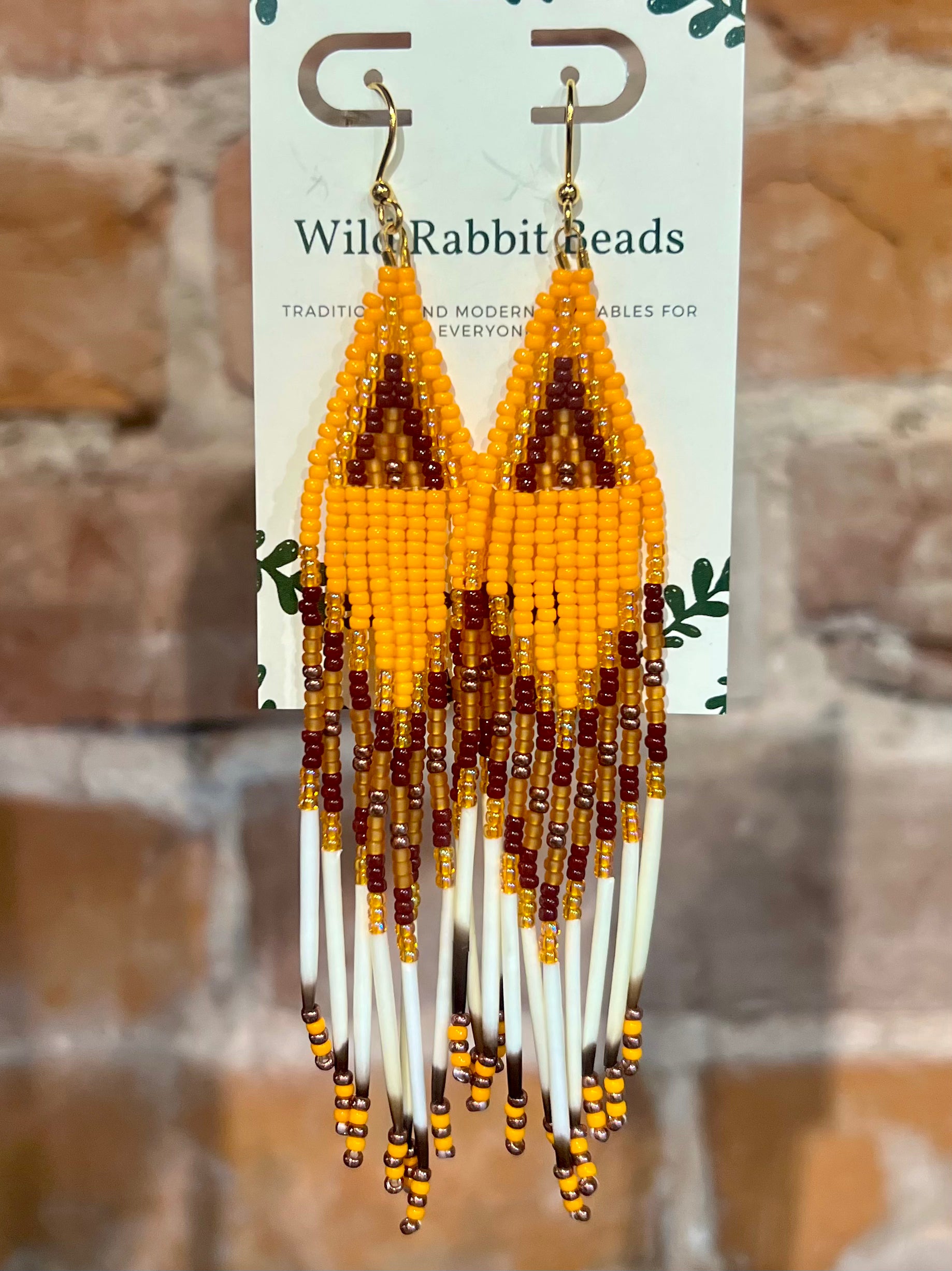Handmade beaded earrings on gold plated hooks, made by local Indigenous artist - Wild Rabbit Beads. "Traditional and modern wearables for everyone."