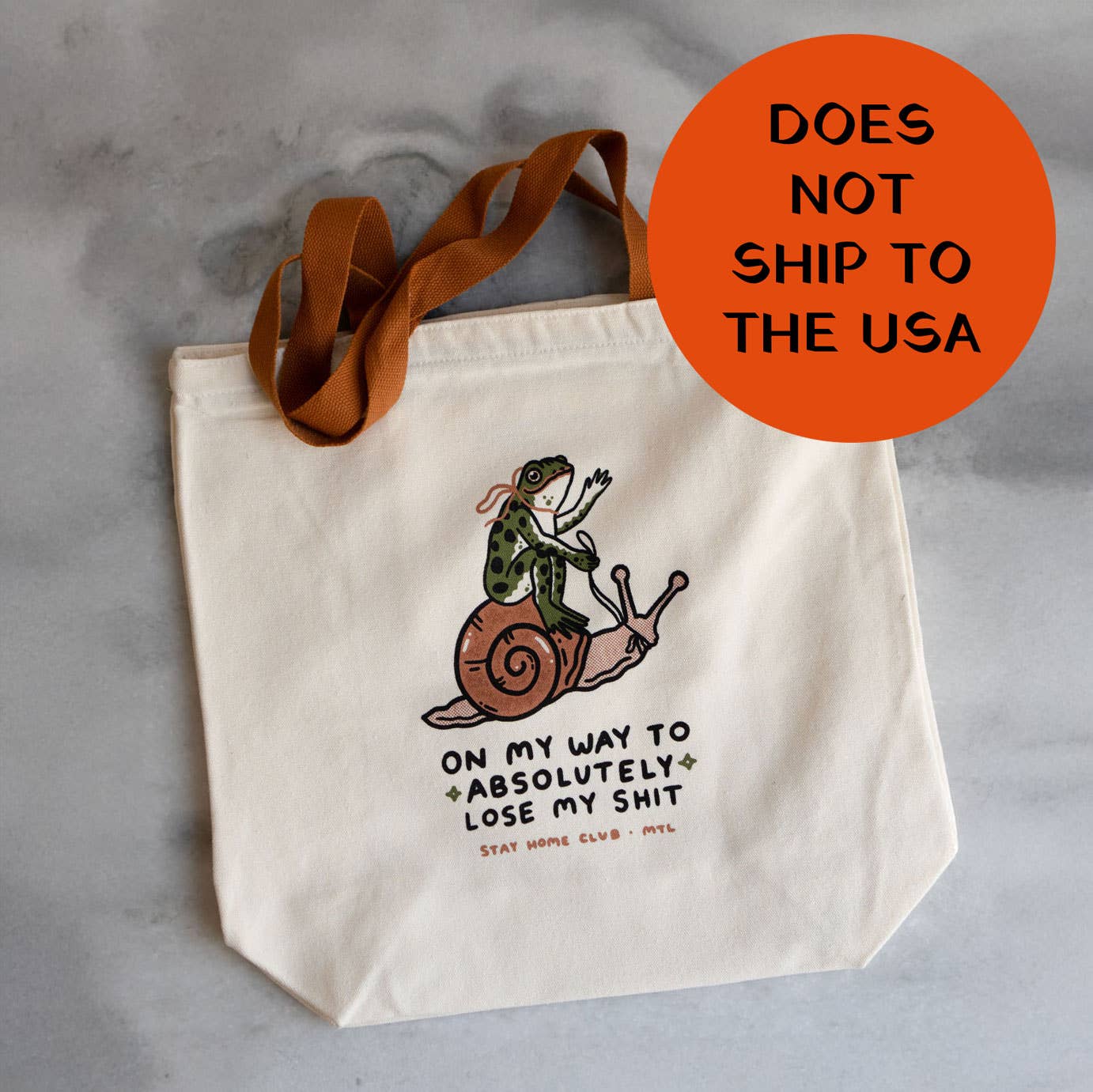 Huge, sturdy canvas tote with gold tone metal zipper and inner pocket -Made of thick 100% cotton canvas - 18” x 17” with 6” gusset and 11” strap drop Our 'Lose My Shit' frog on a snail design is printed in water-based ink on the front of this natural canvas tote with either bubblegum pink or chestnut brown straps.Perfect for big grocery trips, overnight stays, and throwing in an overhead bin (zipper means nothing falls out!)