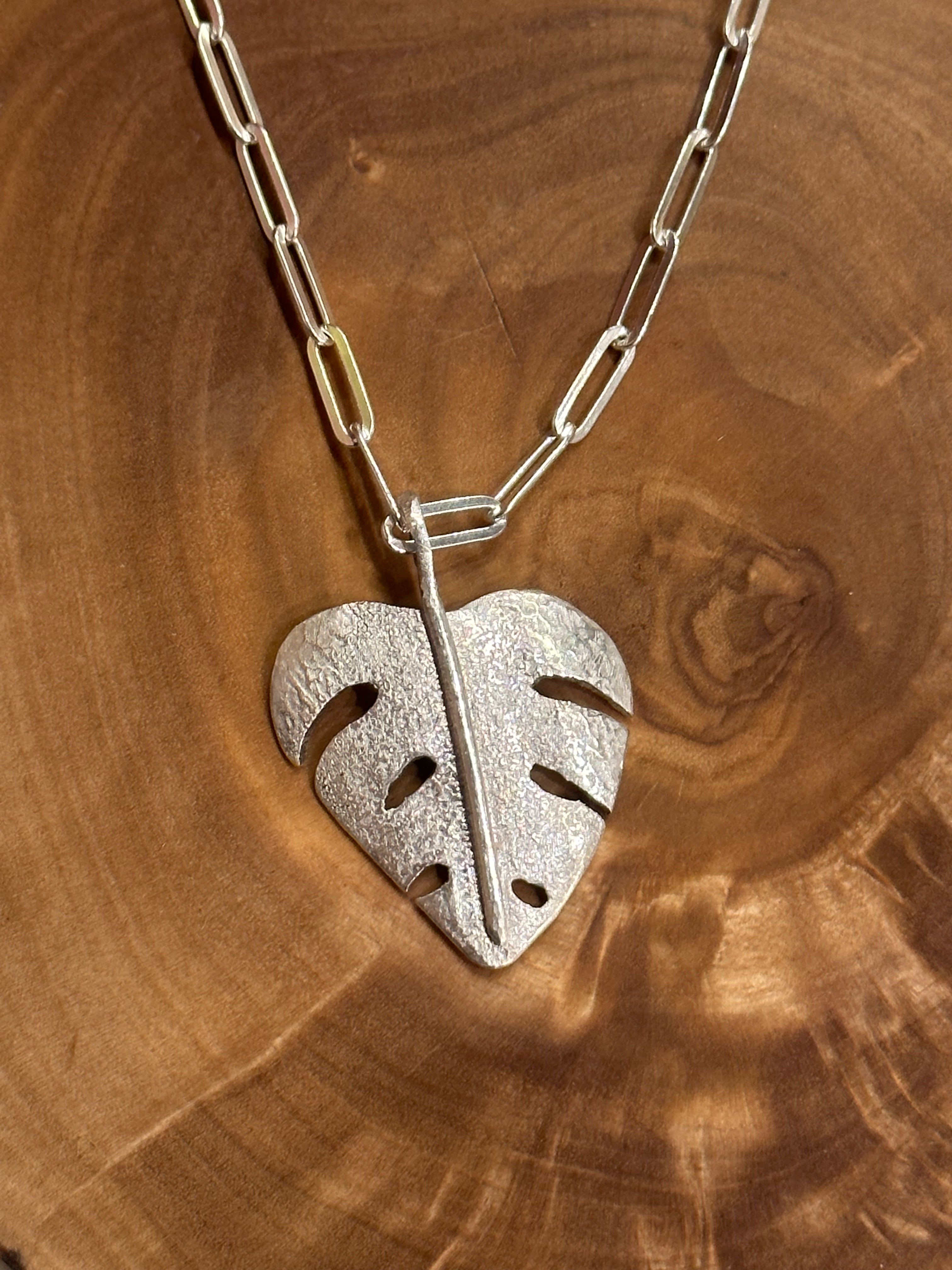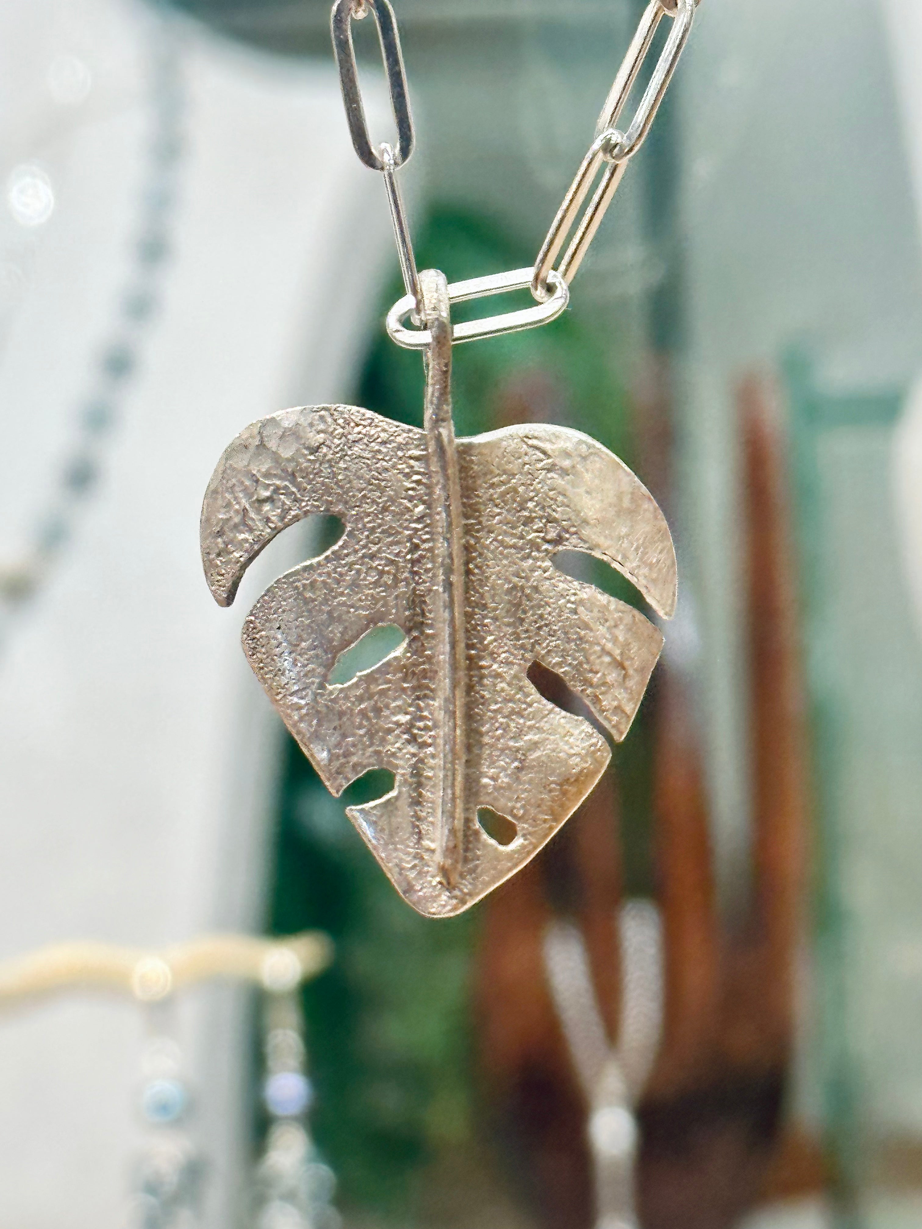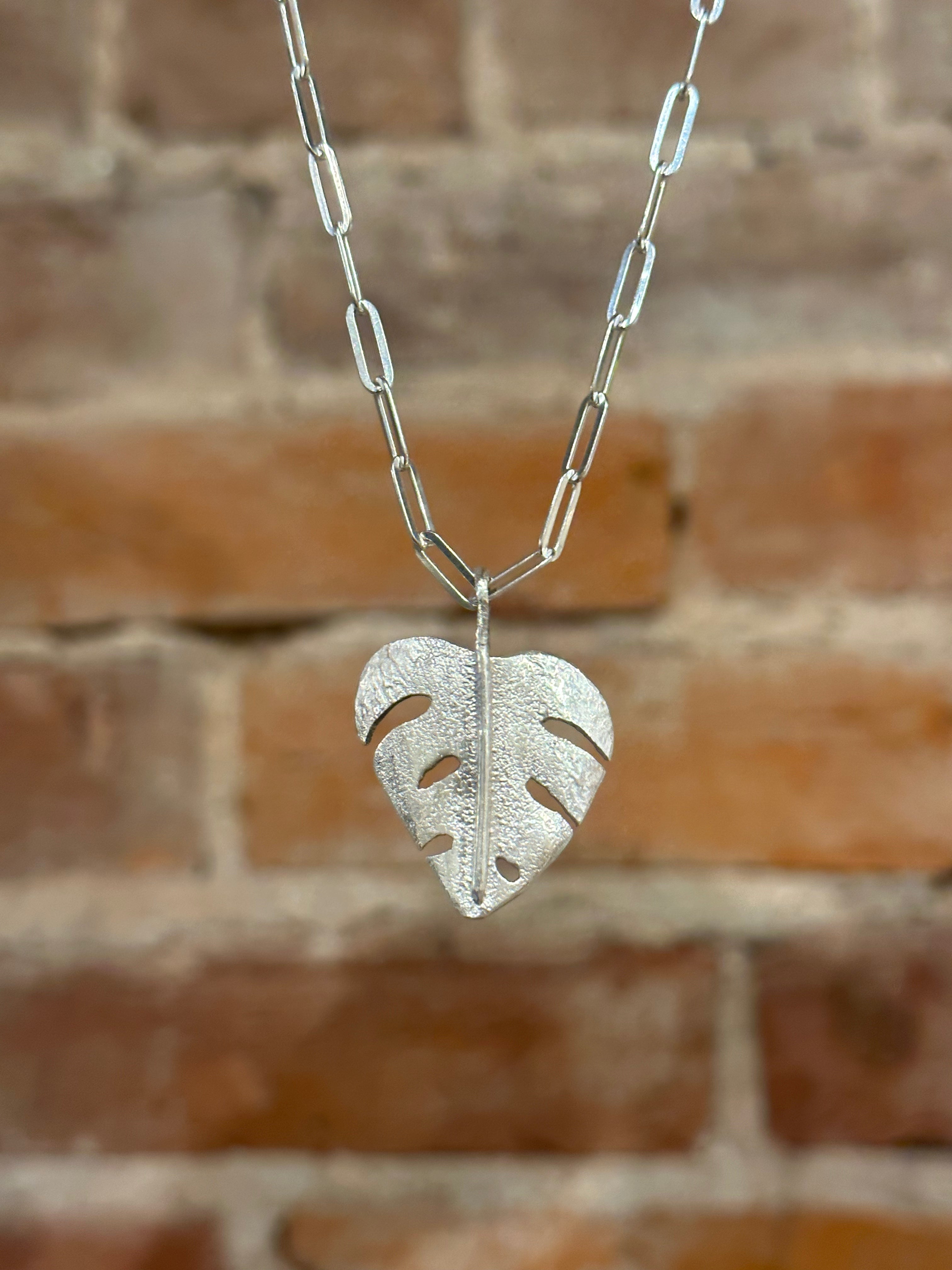 Beautiful handcrafted and fused monstera pendant on a 16" or 18" chain