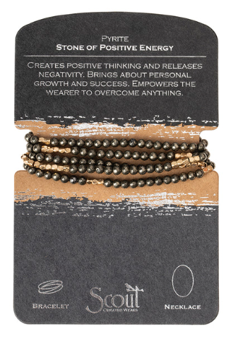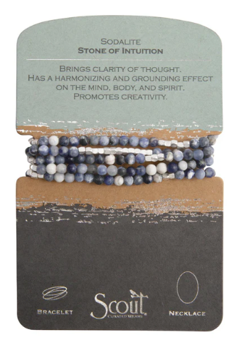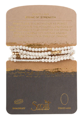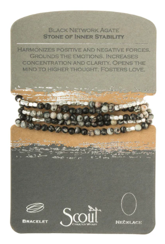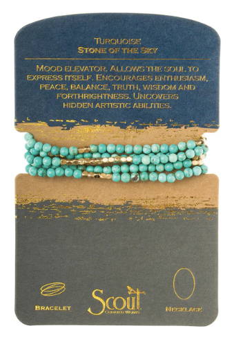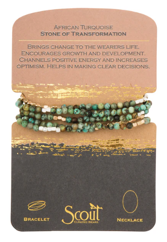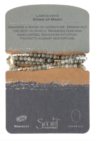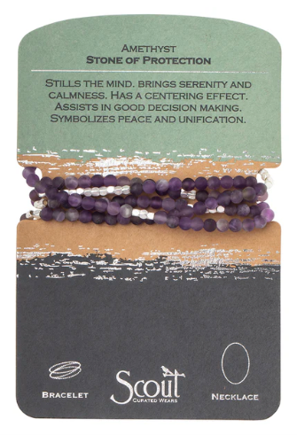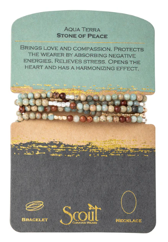 Tap into the energies of the earth.  Semi precious gemstones adorn wrist & neckline. Effortlessly converts from bracelet to necklace.  Can be wrapped 4-5 times as a bracelet and 1-2 times as a necklace.