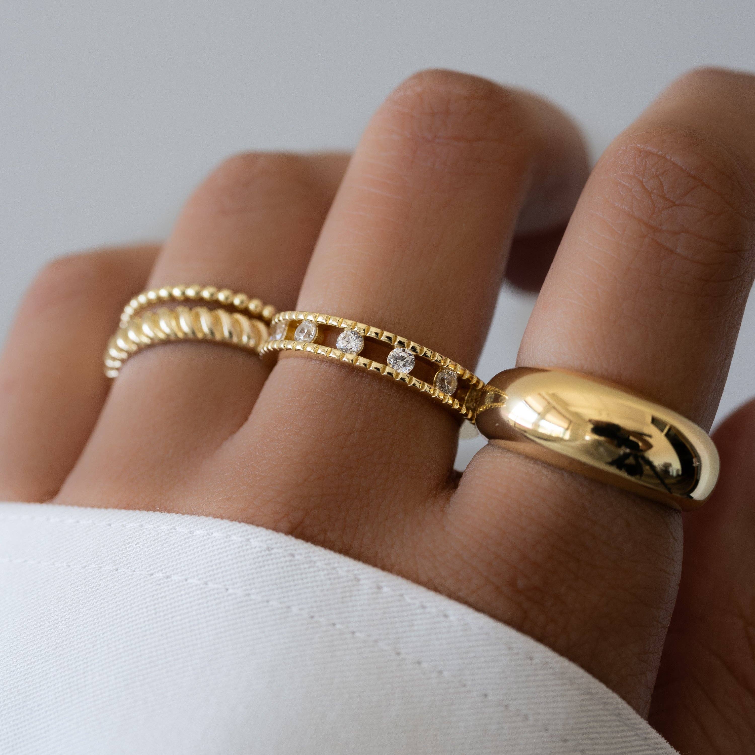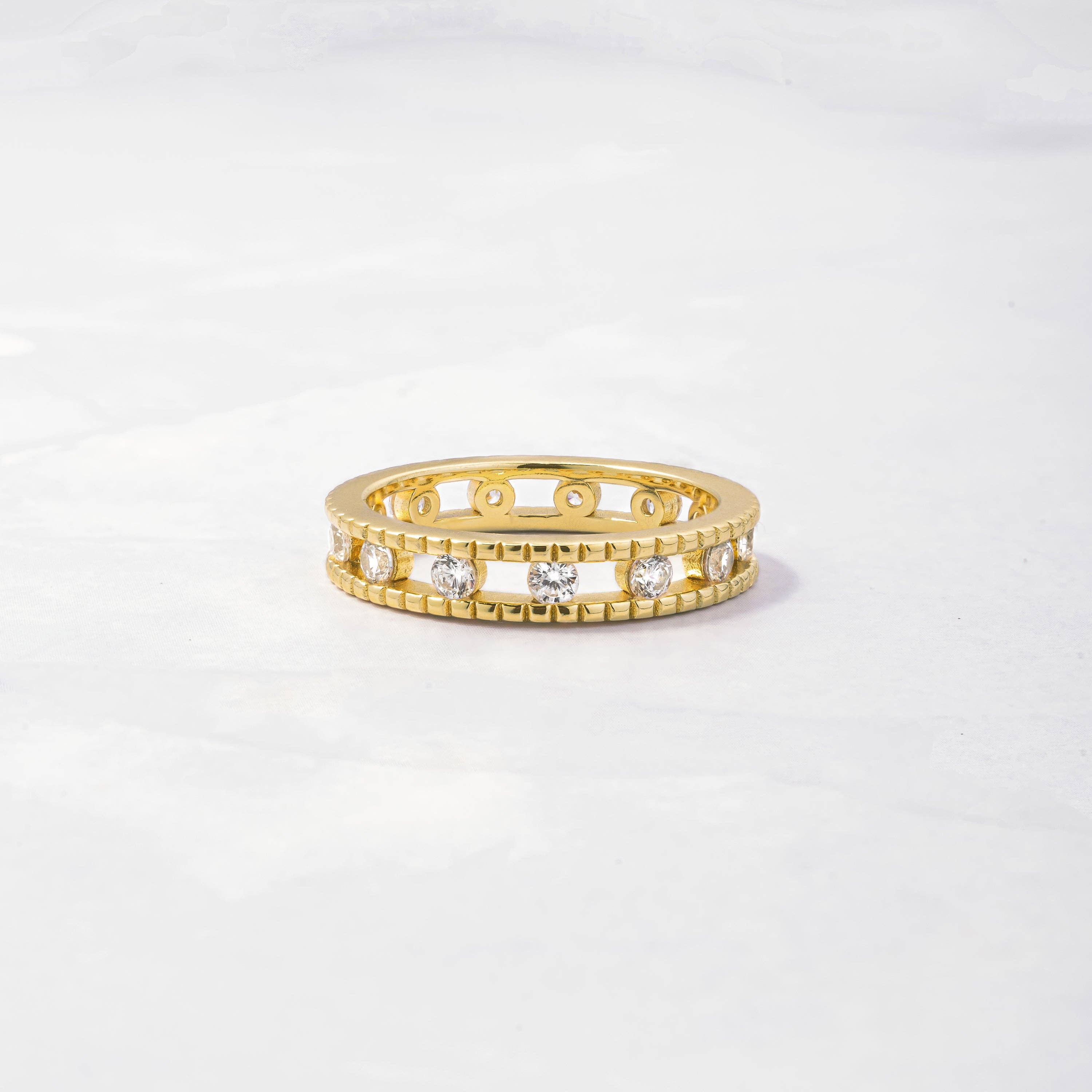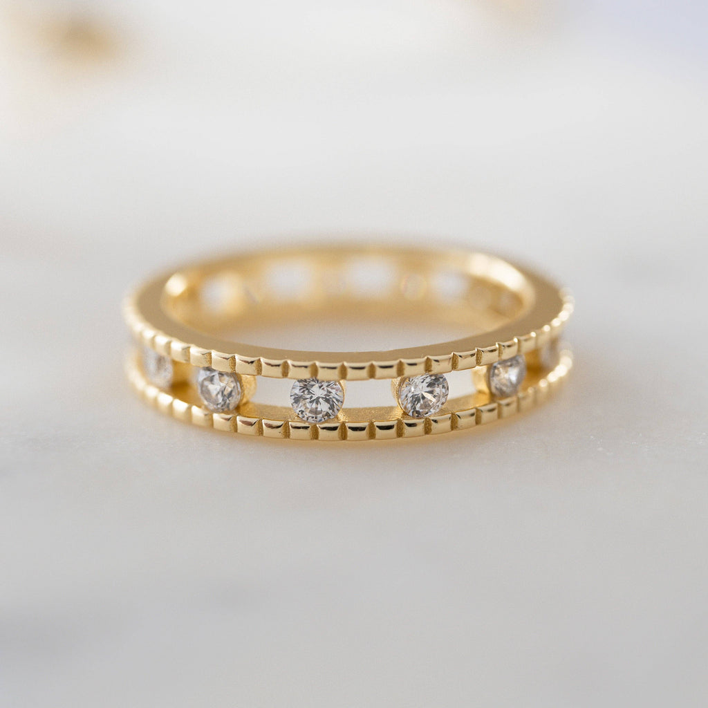Gorgeous eternity style band featuring a delicate design and the illusion of floating diamonds stacked between two bands. Just stunning! Looks great stacked or on its own!